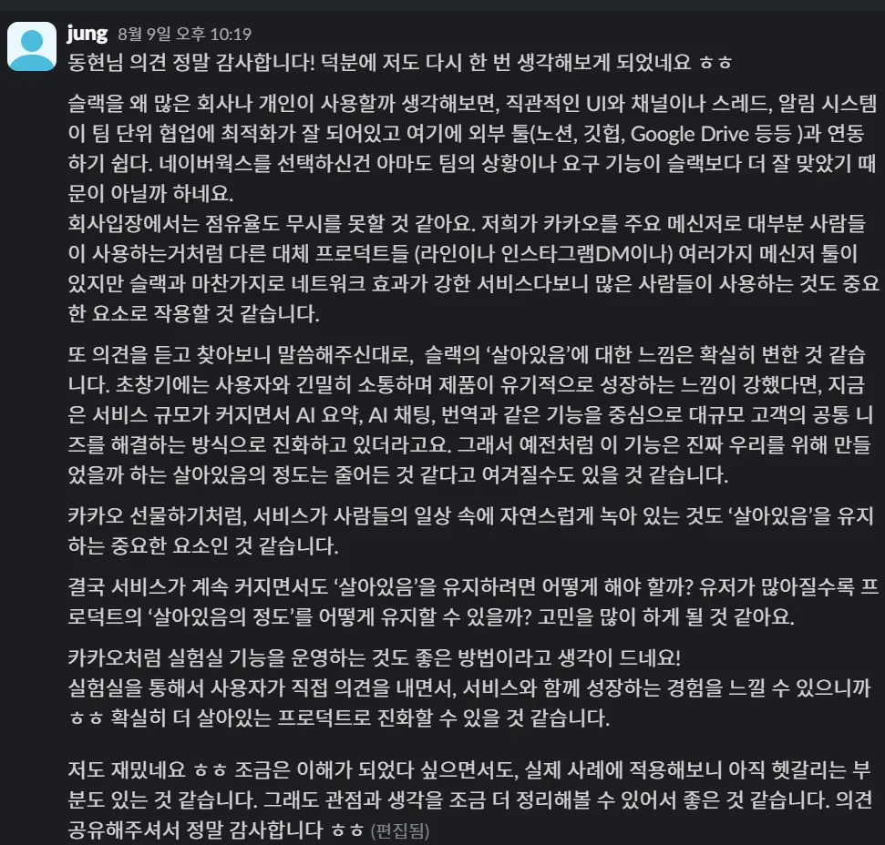 단순히 복잡한 기술을 구현하는 것이 아니라, 유저의 반응과 피드백을 기반으로 유기적으로 변화하며, 작은 변화로도 실질적인 가치를 끌어올릴 수 있는 제품. 그런 제품을 만들어가는 것이 지금의 나에게는 ‘진짜 좋은 프로덕트’라는 생각이 들었다.