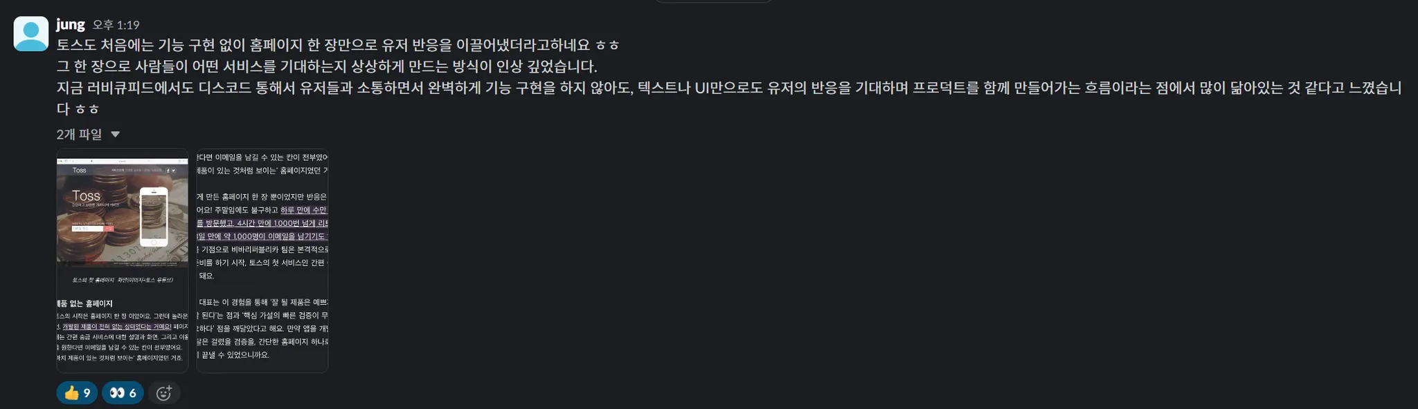 “유저와 끊임없이 피드백을 주고받으며 하나씩 만들어 나가는 프로덕트와, 몇 달 동안 외부와 단절된 채 머릿속으로만 구상한 프로덕트는, 유저가 느끼는 완성도와 생동감에서 큰 차이가 난다.”